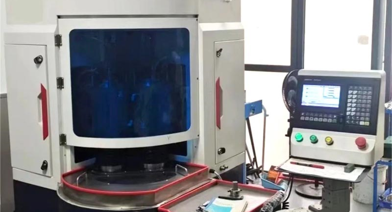 該雙軸端面磨床適用于數控刀片及五金零部件精密平面研磨,可應對硬質合金、金屬陶瓷等材質。其結構主要由一個圓形旋轉工作盤以及兩個立式升降磨頭(精磨和粗磨)組成,每個升降磨頭內部為砂輪主軸。